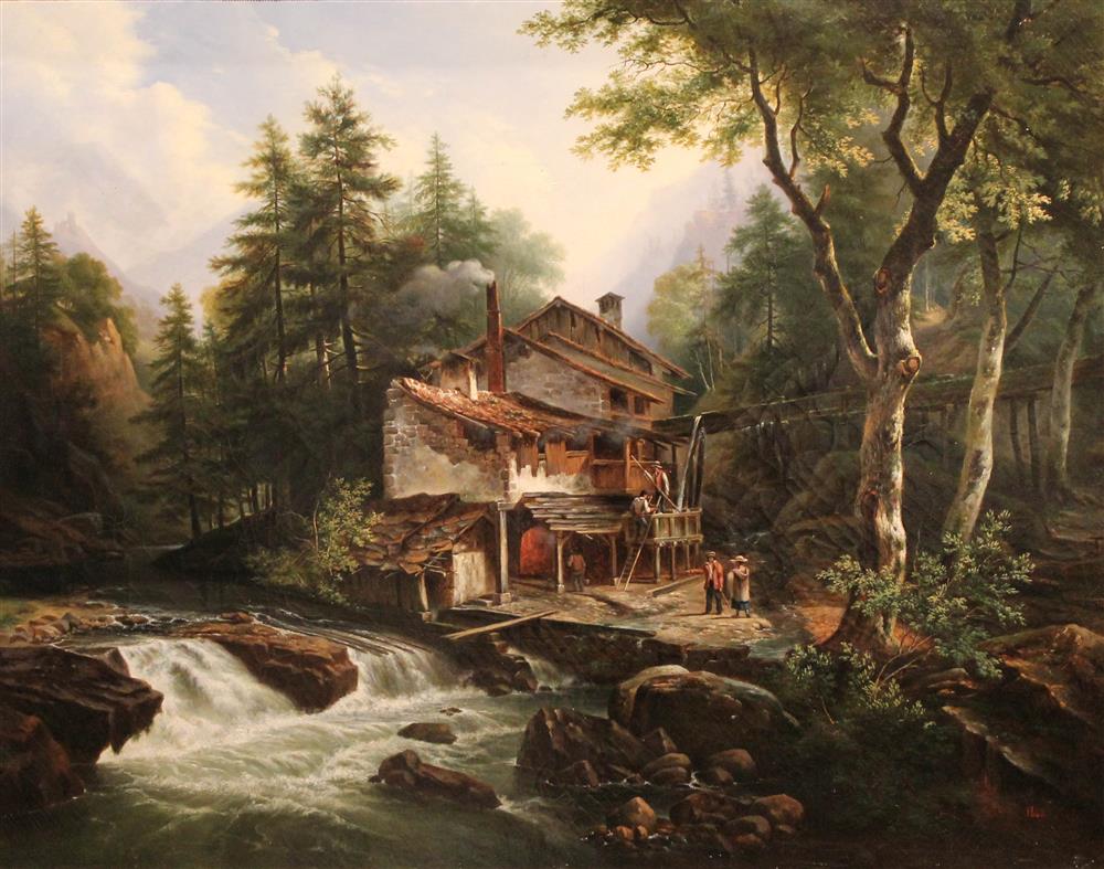| ROMANTIC COUNTRY RIVER LANDSCAPE WITH FIGURES IN THE FOREGROUND | |