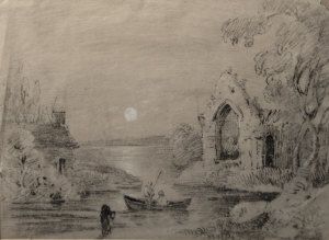 Figures in a boat on a lake with a ruin and a moonlit sky