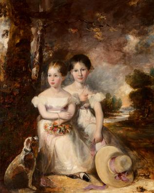 | A portrait of two sisters seated in a landscape with their pet dog | |