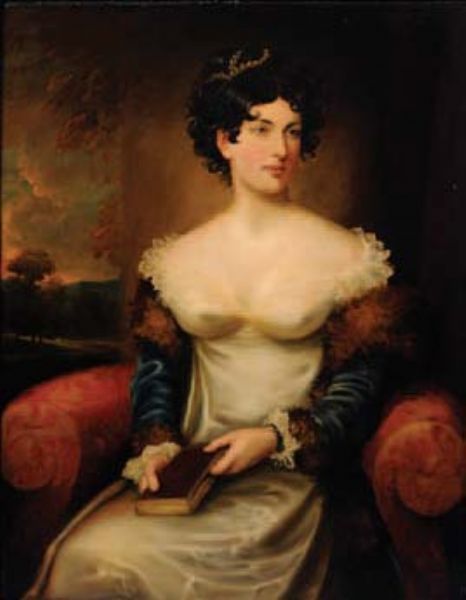 | Portrait of a young lady, half-length seated at a window, holding a book, with dark curling hair and wearing a tiara, white lace | |