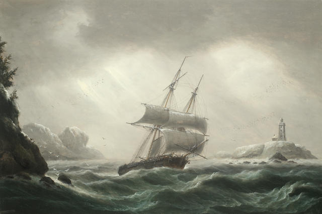 An American brig passing Sambro Lighthouse, Nova Scotia
