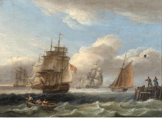 Royal Naval warship and other shipping off the coast in rough seas; and A Warship in a calm (a pair)