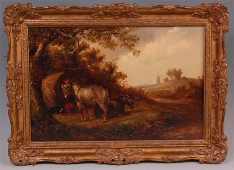 | Donkeys and sleeping dog by a travellers encampment with windmill beyond | |