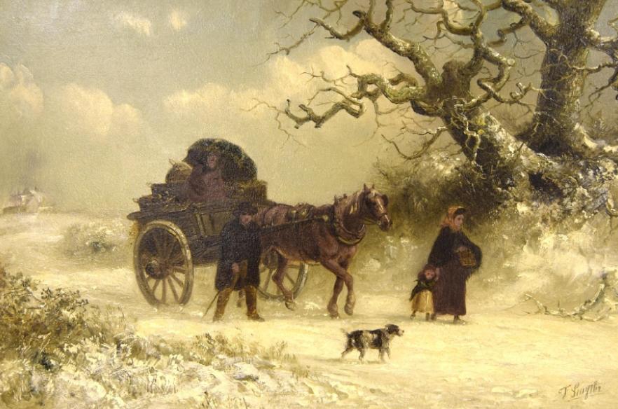 | Travellers with their horse and cart in a winter landscape, a dog in the foreground | |