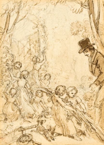 | a group of narrative scenes, 2 of children gathering hops, and garlanding an arch, on either side of a single sheet, also a pas | |