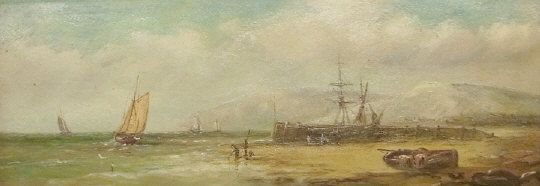 Seascape showing beached fishing boat, fishing boats in the background and fishermen