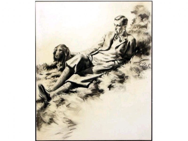 | Pipe smoking reclining gentleman wearing matching jacket Plus fours and argyle socks with man's best friend | |