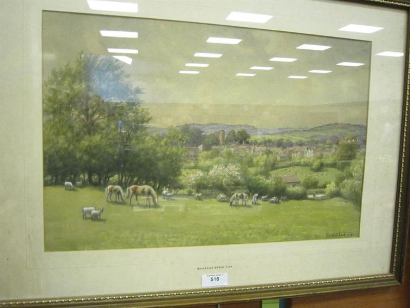 Meadow above Clun, view of Clun with horse and sheep in the foreground