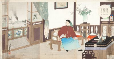 | Chiński admirał Ding Ruchang popełniający samobójstwo, rycina z cyklu: "Wojna japońsko - chińska" | |