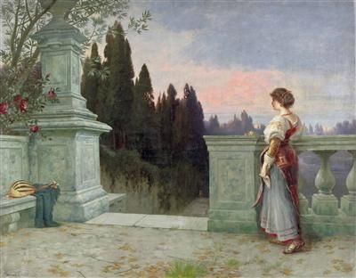 | Dame blickt vom Balkon einer italienischen Villa auf das Meer | |