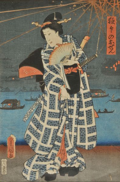 | Lady Osen holding a fan, watching fireworks at night | |