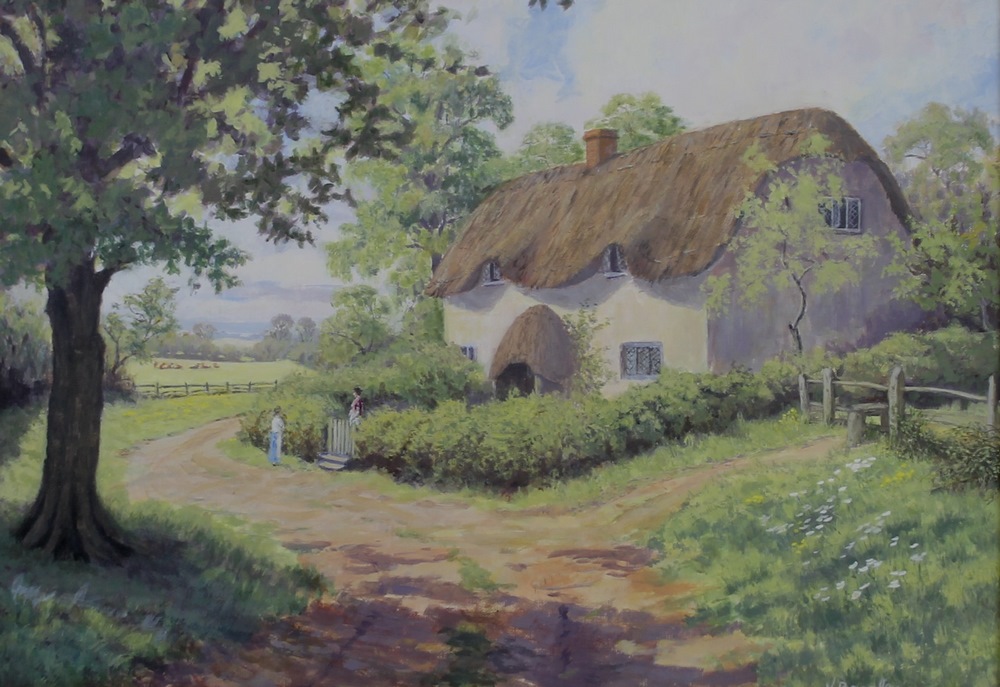 | a thatched cottage in the country with two ladies conversing at the gate | |