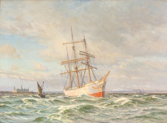 | Seascape with a sailing ship anchored in the Sound, in the distance Kronborg Castle | |