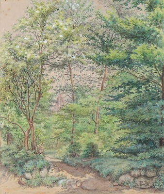 | A gable visible through the foliage of a beechforest | |
