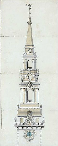 | Drawing of the spire of the Church of Our Lady in Copenhagen with a sample of the tower. | |