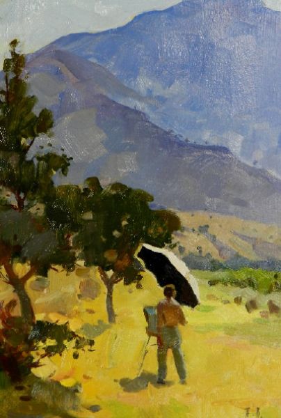 An artist sketching in a sunlit landscape