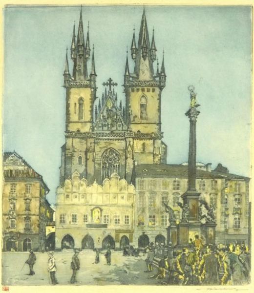 | OLD TOWN SQUARE. View of Týn Church of that time with still standing Marian Column | |