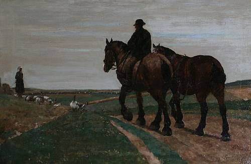 A field with figures, carthorses and geese