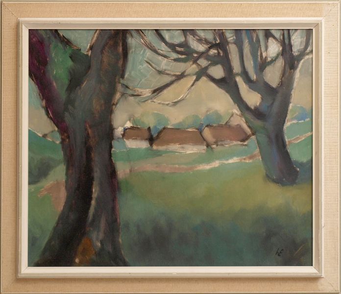 Frühlingspartie im Markgräflerland. Mächtiges Gehöft zwischen zwei entlaubten Bäumen.