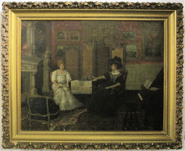 a richly decorated Victorian formal sitting room with two ladies having tea