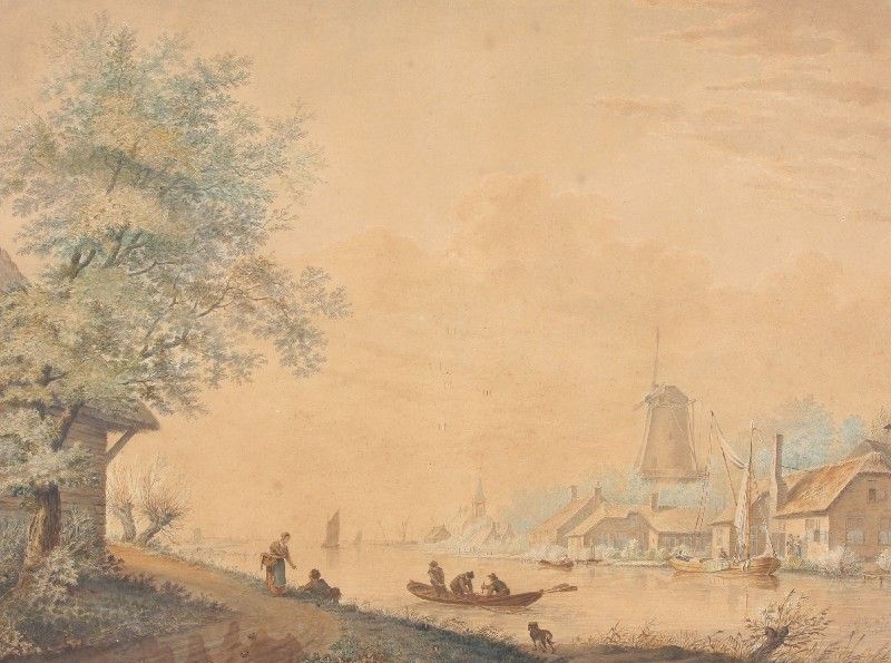River landscape with fishermen and sailing boats, at the horizon a village and a windmill