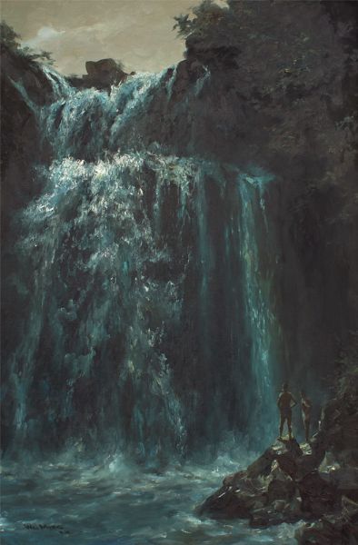 Two Figures Looking on a Tropical Waterfall