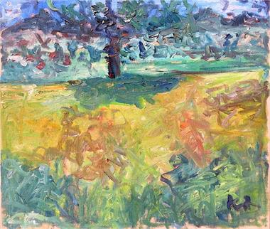 Meadow landscape with a tree and mountains in the background.