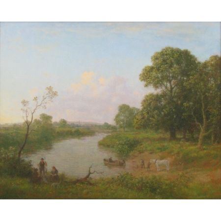 | The Ferry Boat, river landscape scene with figures in a boat and on the bank, a horse by the water | |