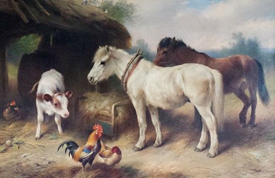 Farmyard scene with ponies, calf and chickens