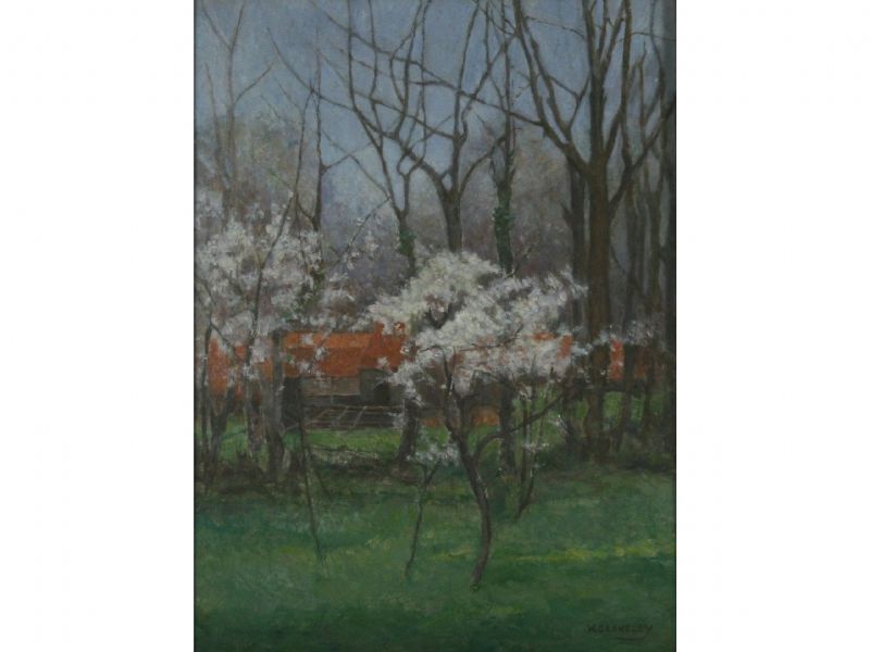 THE OLD RED BARN, a view of a red barn through autumnal trees