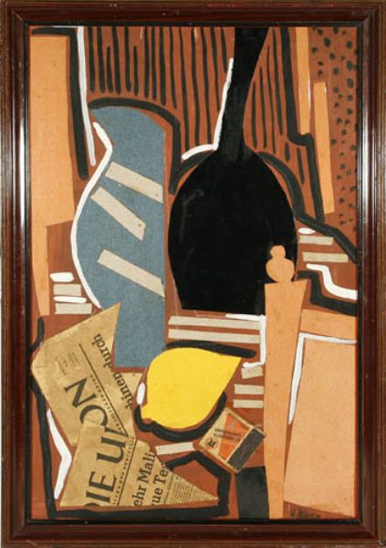 Abstrahierendes Stilleben mit Flasche, Zitrone, Zeitung und Zündholzschachtel