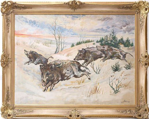 Wildschweinrotte in verschneiter Landschaft unter winterlichem Himmel