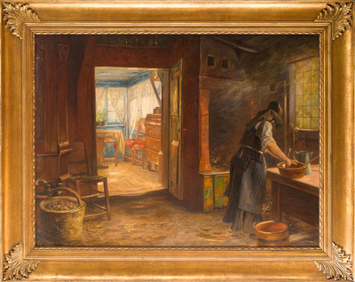 | Im Deichhof. Kücheninterieur mit Blick in die Wohnstube. Am Holzstich arbeitende Bäuerin | |
