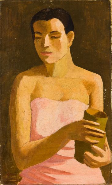 Junge Frau im rosa Kleid und Tontopf in Händen