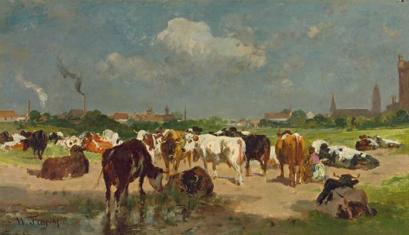 Lagernde Kühe vor einer Stadt (vermutlich Karlsruhe-Daxlanden).