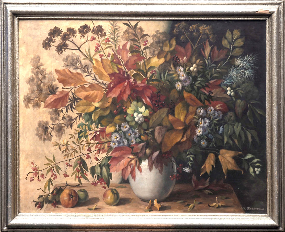 | Bunter Herbststrauß mit Blättern, Blüten und Früchten in grauer Tonvase, daneben abgefallene Blätter | |