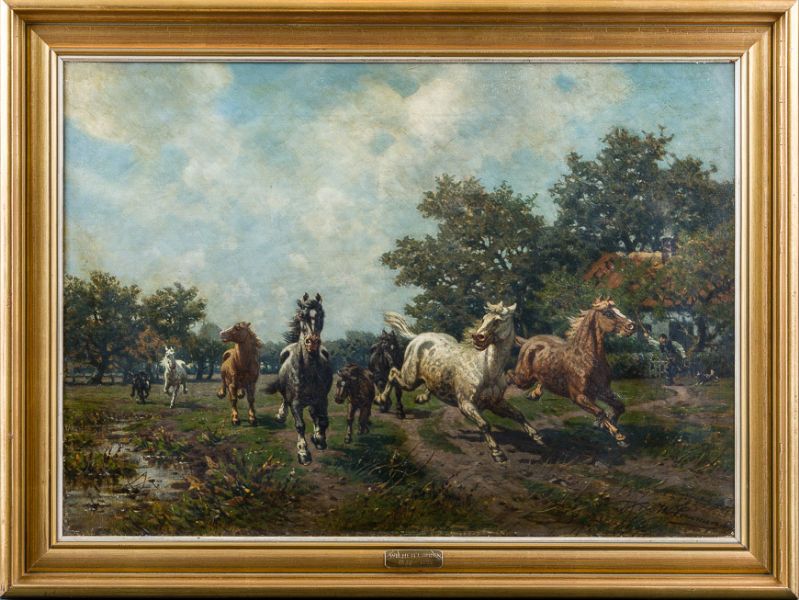 Dahinstürmende Pferdeherde auf Weide, ein Bauer beim Versuch sie aufzuhalten