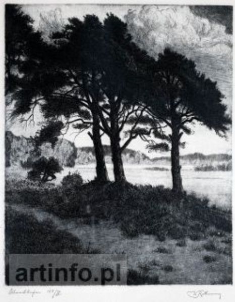 PEJZAŻ Z SOSNAMI NAD JEZIOREM