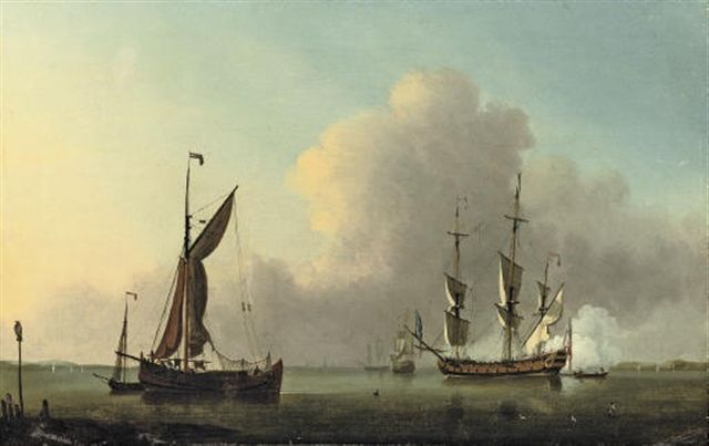 | Ships in a calm sea off the coast with a man o' war firing the morning gun | |