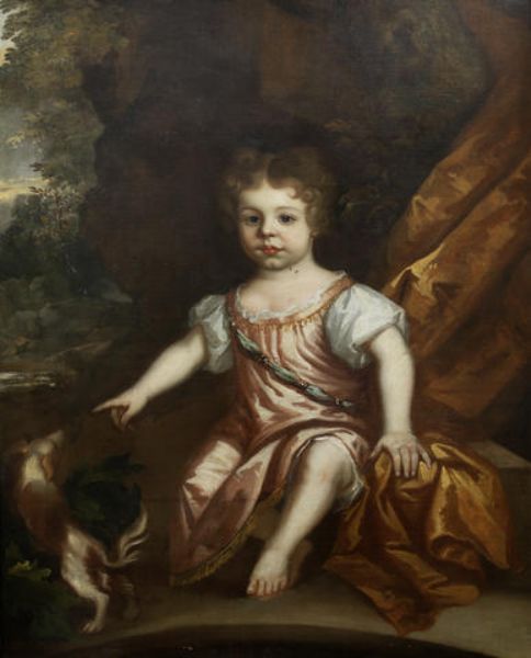 | Portrait of a young boy, full length, seated in a landscape wearing pink robes, his dog by his side | |