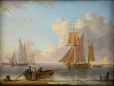 Coastal landscape with figures and a rowing boat in the foreground and sailing vessels at sea