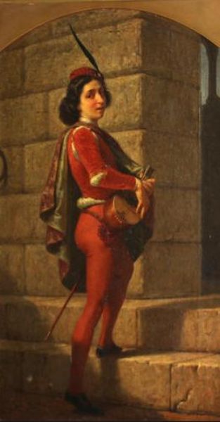 Or long-hair'd page in crimson clad