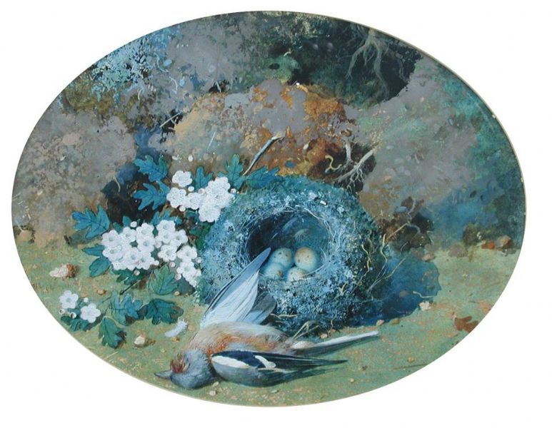 A Dead Chaffinch, a Bird's Nest, and Flowers on a Bank