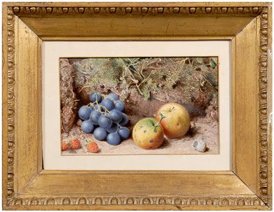 | still life with grapes, apples and strawberries against a mossy bank | |