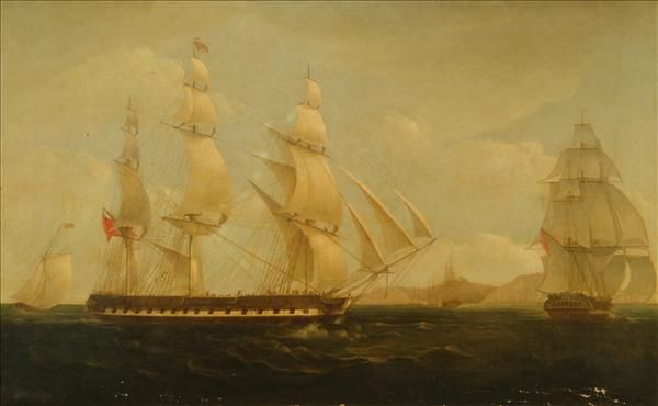 The East Indiaman Ceres, in two positions, arriving off St. Helena