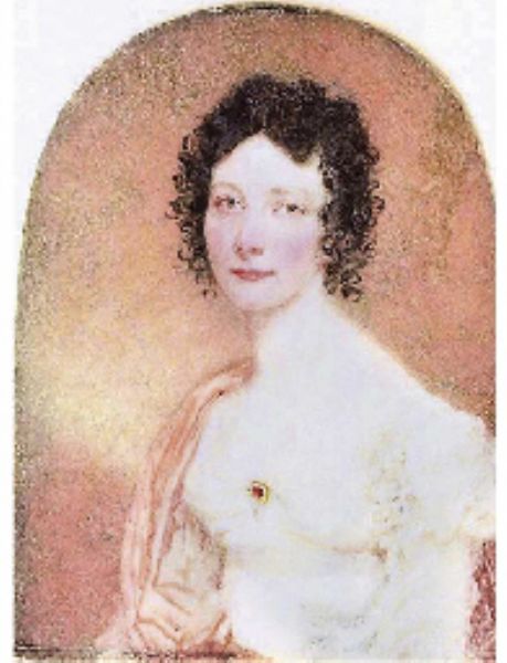 | A young lady, in white dress with brooch at corsage, a pink stole over her shoulder, her dark hair in ringlets | |