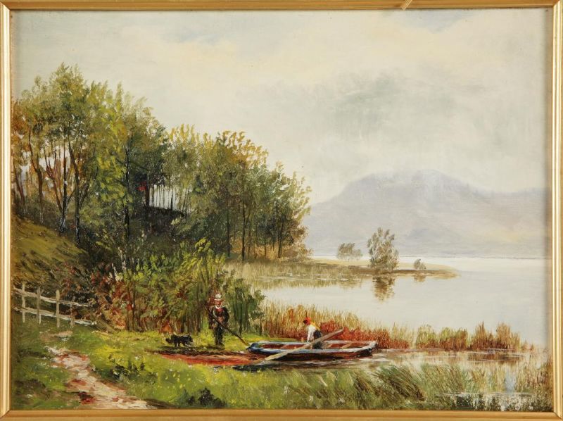 | COCKSHOT POINT WINDERMERE, a moored punt with figures on a summer's day | |