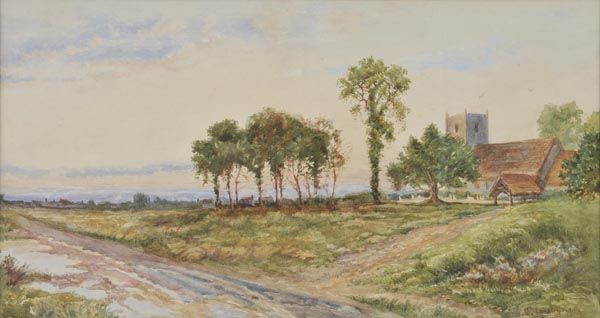 Country track with church and buildings in the distance