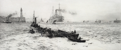 | Depicting a tug boat towing seven fishing boats into harbour, | |