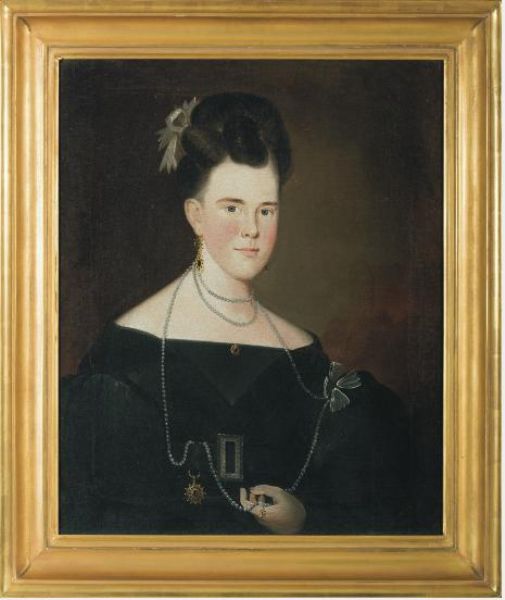 | PORTRAIT OF A YOUNG WOMAN IN BLACK DRESS, WEARING A LONG STRAND OF PEARLS. | |